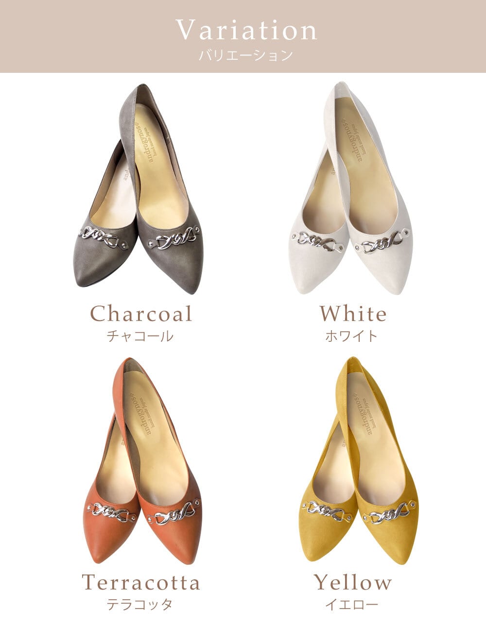 ブラック・イエロー・オーク(薄茶)・テラコッタ(オレンジ)・ホワイト・グリーン・チャコール(灰色)・キャメル(明るい茶)